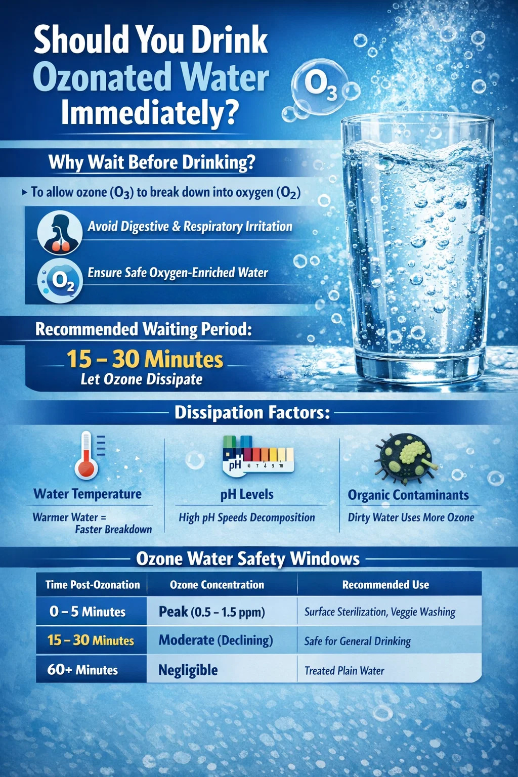 پاسخ کوتاه این است خیر، معمولاً باید حداقل 15 تا 30 دقیقه صبر کنید پس از فرآیند ازن زنی قبل از نوشیدن آب. در حالی که آب ازن فوق العاده موثر است به عنوان یک ضد عفونی کننده نوشیدن آن در حالی که غلظت گاز ازن در اوج خود است می تواند منجر به تحریک جزئی دستگاه گوارش یا سیستم تنفسی به دلیل خارج شدن گاز از مولکول های باقیمانده ازن شود.