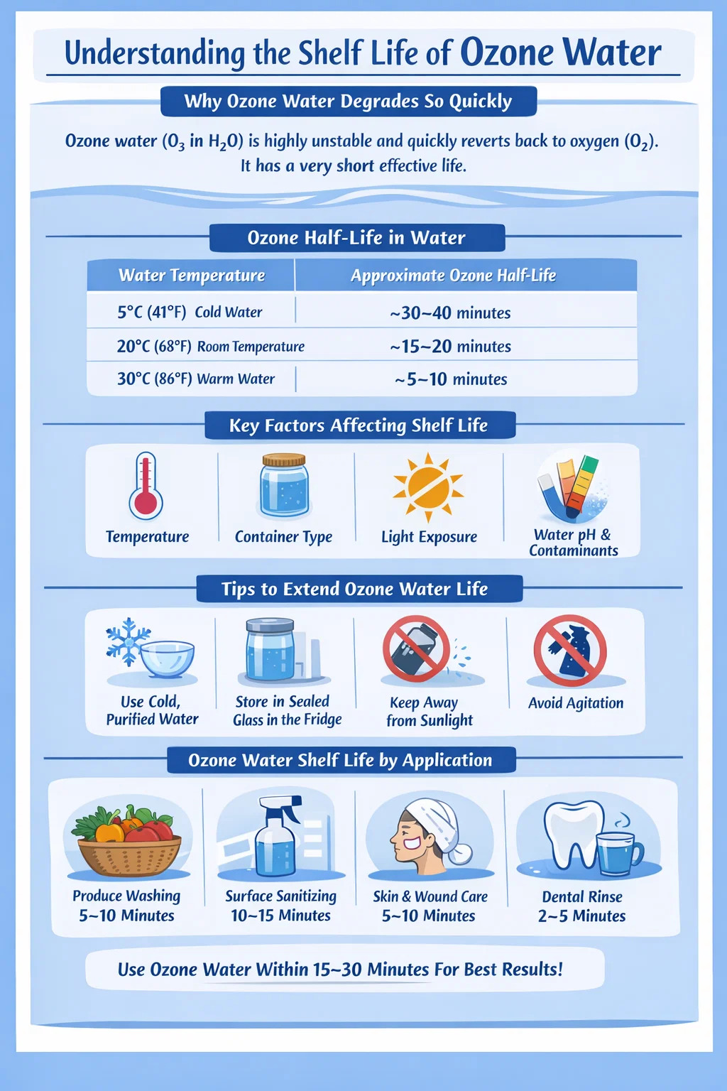 آب ازن یک عامل ضد عفونی کننده قوی و بدون باقی مانده با سابقه مستند در ایمنی مواد غذایی، تصفیه آب و گندزدایی سطحی است. اما اثربخشی آن کاملاً وابسته به زمان است. در دمای اتاق، شما تقریباً 15 تا 30 دقیقه فعالیت معنی دار ازن پس از نسل دارید. این پنجره در یک ظرف شیشه ای دربسته در یخچال نگهداری می شود و می تواند 30 تا 45 دقیقه طول بکشد. فراتر از آن، شما با آب معمولی کار می کنید.