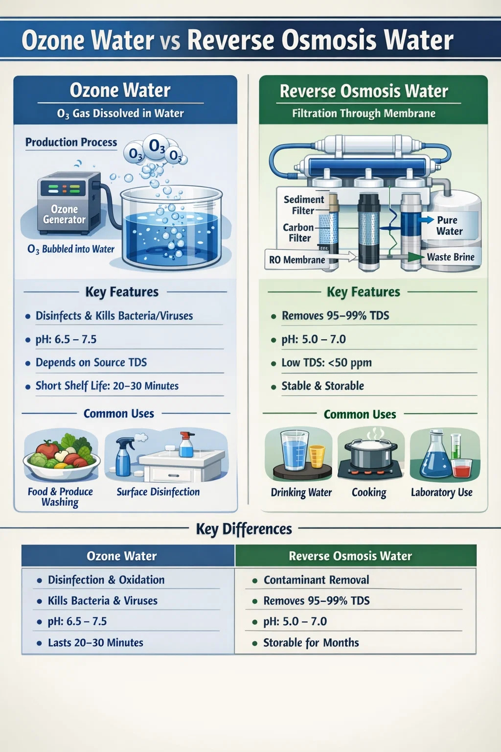 آب ازن در بیمارستان ها، مراکز پردازش مواد غذایی، کلینیک های دندانپزشکی و آشپزخانه های تجاری برای ضدعفونی سطوح استفاده می شود. پاتوژن ها را روی میزها، تجهیزات و سطوح تماس با غذا بدون برجای گذاشتن بقایای شیمیایی از بین می برد - چیزی که ضدعفونی کننده های مبتنی بر کلر نمی توانند ادعا کنند. پس از تجزیه ازن، تنها اکسیژن خالص باقی می ماند. آب RO هیچ قابلیت ضد عفونی کننده ای ندارد و در هیچ زمینه بهداشتی جایگزین مناسبی نخواهد بود.